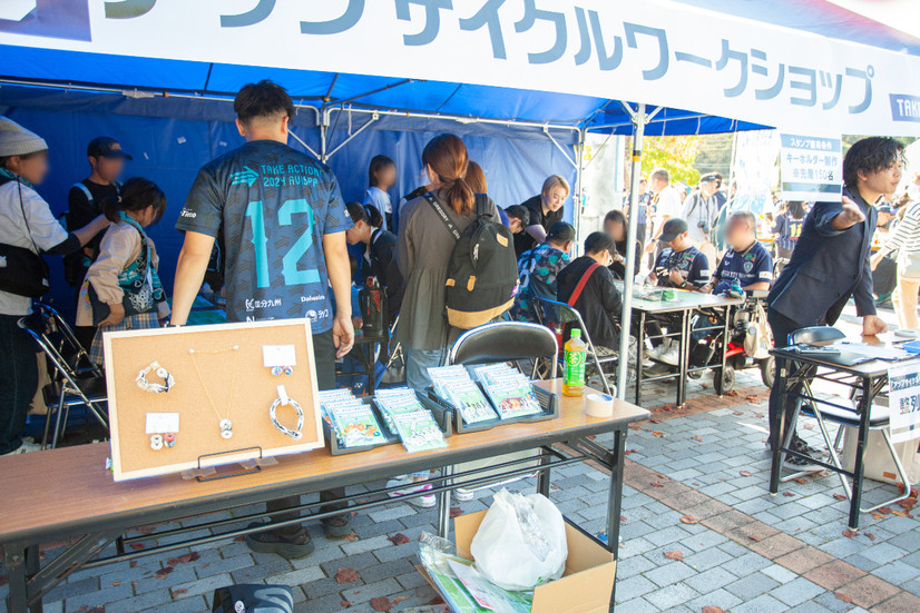 使用済みサッカーボールをサポーターやスポーツ団体アップサイクルし、キーホルダーにリメイクする体験をするワークショップ。思い出が“新しい形”になって残ります。